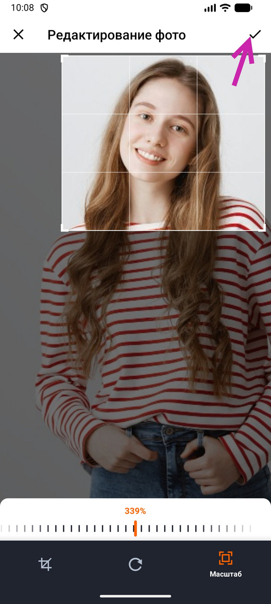 На экране редактирования фото вы можете его повернуть, обрезать, изменить масштаб. После редактирования фото нажмите галочку справа вверху, и ваша отредактированная копия фото будет сохранена в ваших фотографиях.