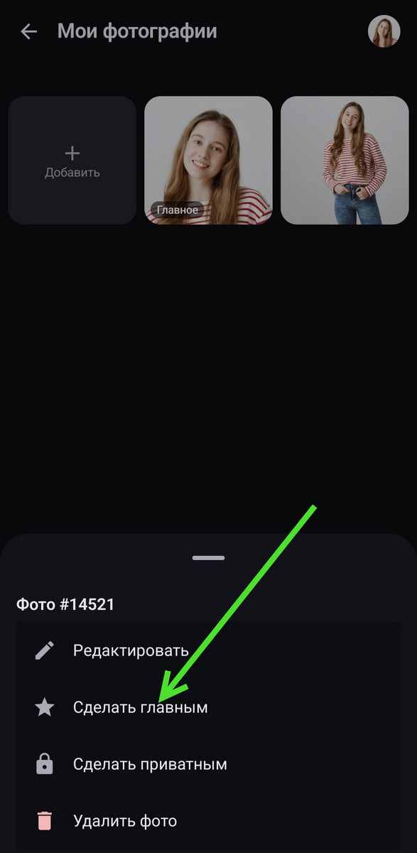 На экране управления фото нажмите на фотографию, которую хотите установить на аватар, откроется меню, как показано на скриншоте, выберите пункт «Сделать главным».