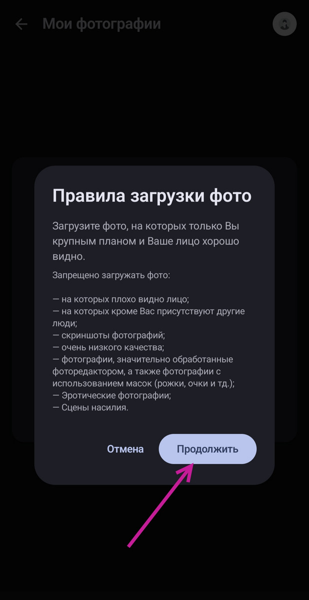 Откроется модальное окно с правилами загрузки фото, обязательно прочтите их и нажмите «Продолжить», как показано на скриншоте.