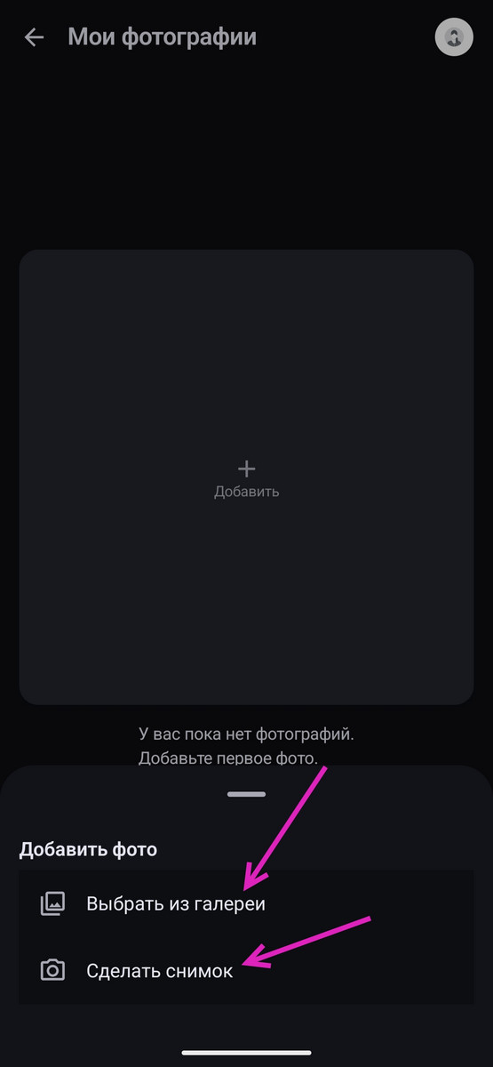 В меню выберите один из вариантов, как показано на скриншоте: выбрать из галерей или сделайте снимок с помощью камеры.