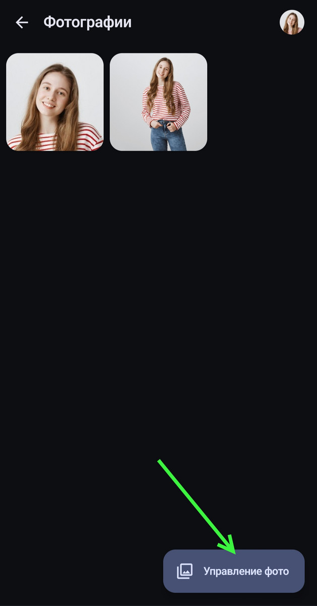 На экране просмотра своих фотографий внизу нажмите кнопку «Управление фото», как показано на скриншоте.