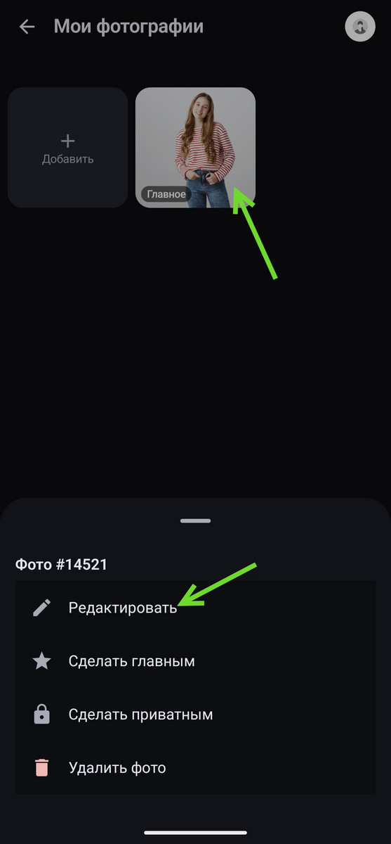 Нажмите на фото, которое хотите отредактировать, в меню выберите пункт «Редактировать».