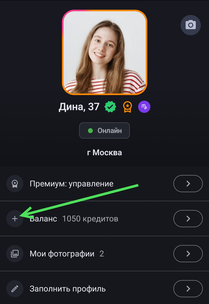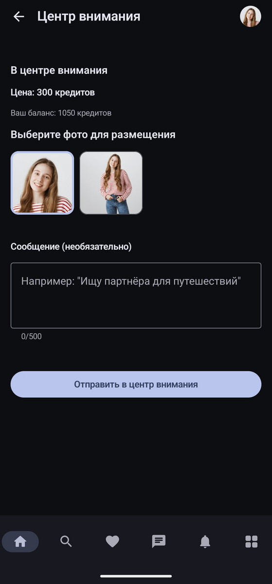 Для размещения анкеты в центре внимания выберите одно из ваших изображений, которое хотите использовать, добавьте текст, укажите, кого вы ищете, и определите цели знакомств. Возможности ограничены только вашей фантазией и объемом в 500 символов. Эта услуга платная и стоит 300 кредитов. Если на вашем счете недостаточно средств, пополните баланс.