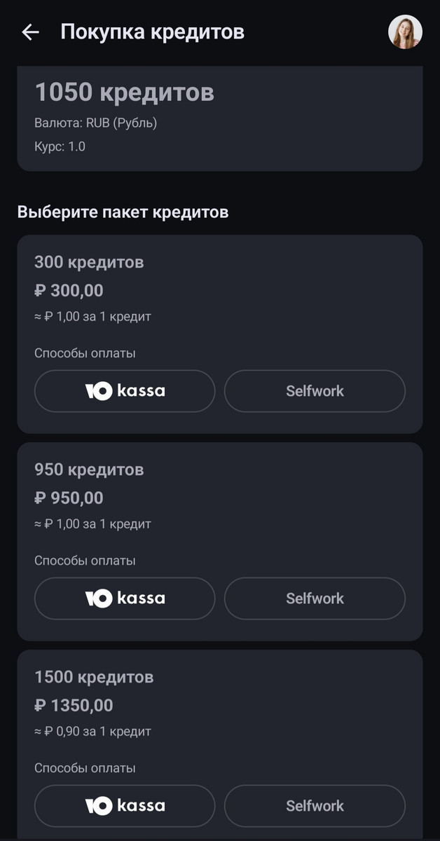 Выберите пакет кредитов, который хотите приобрести, и оплатите через ЮКассу или Selfwork.