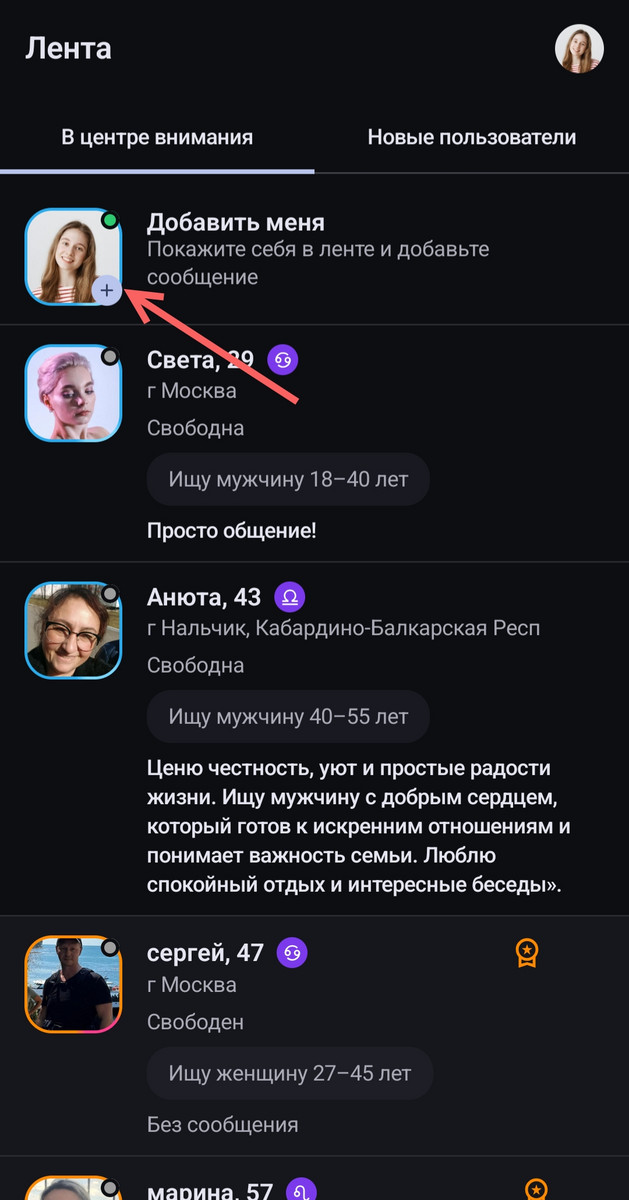 На главном экране «Лента» на вкладке «В центре внимания» нажмите на «+» добавить меня, как показано на скриншоте.